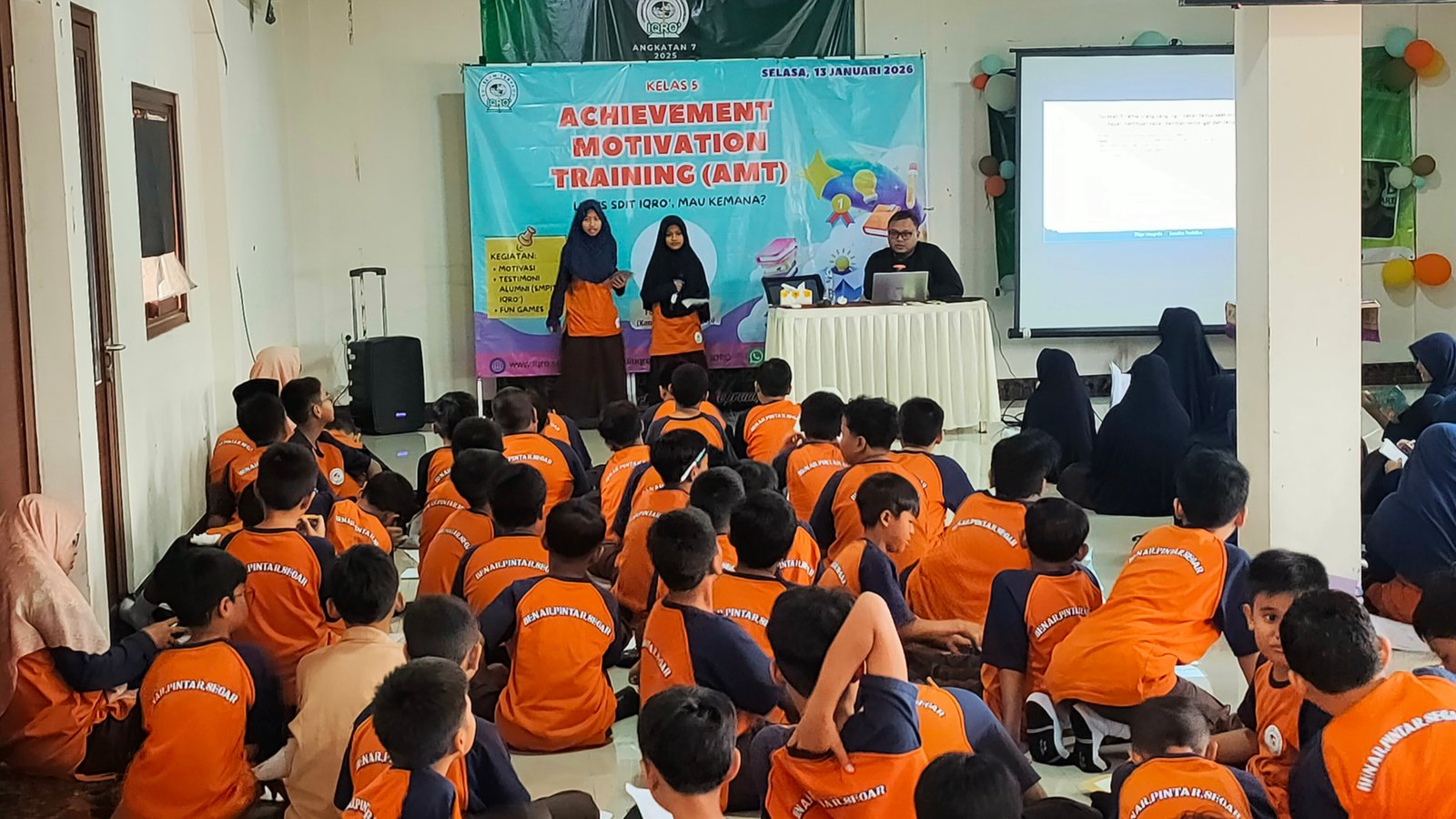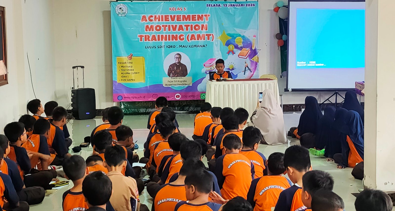 Kegiatan ini diisi oleh pemateri konsultan pendidikan bapak Fajar Tri Nugroho, S.Pd dengan memberikan motivasi dan Fun Games, tak lupa kegiatan AMT juga menghadirkan perwakilan murid alumni SDIT IQRO' yang sedang menuntut ilmu di SMPT IQRO' sebanyak 5 murid, mereka membagikan pengalaman yang menarik dan menyenangkan selama belajar di SMPIT IQRO, di sesi akhir kakak-kakak alumni membagikan doorprize pada murid kelas 5 yang dapat menjawab pertanyaan dengan baik.,