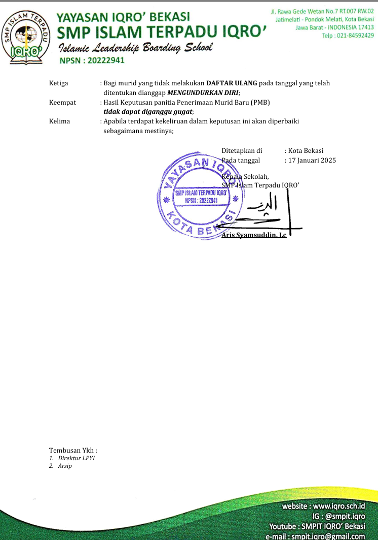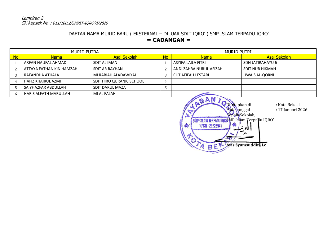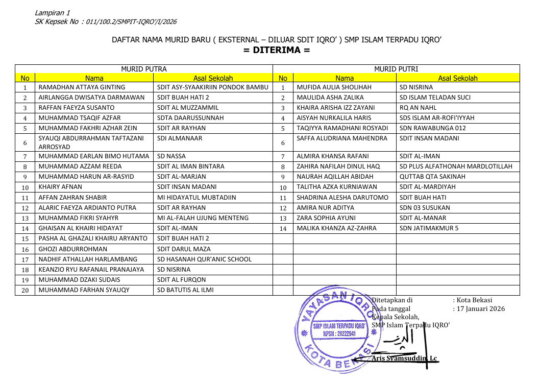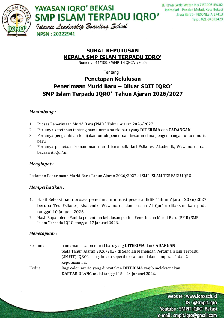 Dengan ini kami sampaikan hasil penetapan kelulusan PMB SMPIT IQRO' Eksternal sebagai berikut :
