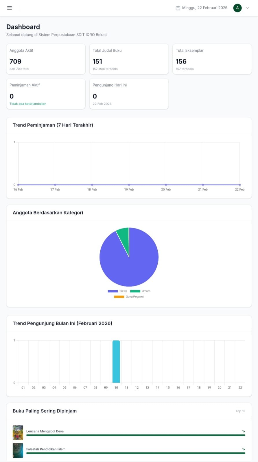 Alhamdulillah pada bulan Februari 2026, mahasiswa Unindra yang dimotori Gilang Permana Putra dan Asep Kurniawan ini, telah berhasil menyelesaikan sistem aplikasi perpustakaan sistem dan sudah dinstall secara online melalui domain dan hosting www.iqro.sch.id. Dalam hal ini sistem aplikasi ini sudah dapat digunakan oleh para pengunjung baik murid, guru, pegawai, maupun kalangan umum. Selain itu juga petugas perpustakaan sudah dapat melakukan input data buku, anggota, dan transaksi lainnya.