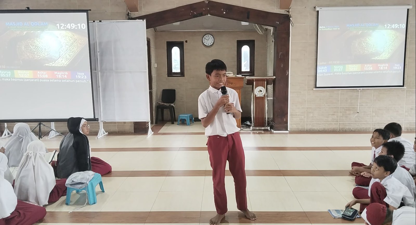 Dokumentasi: Kultum Ramadhan 1447 Hijriah disampaikan oleh Dzafran Abassy Kelas 5C dengan tema Waktu Luang Hal Yang Paling Nikmat, Yang Paling Banyak di Sia - siakan (Foto: Publikasi SDIT IQRO')