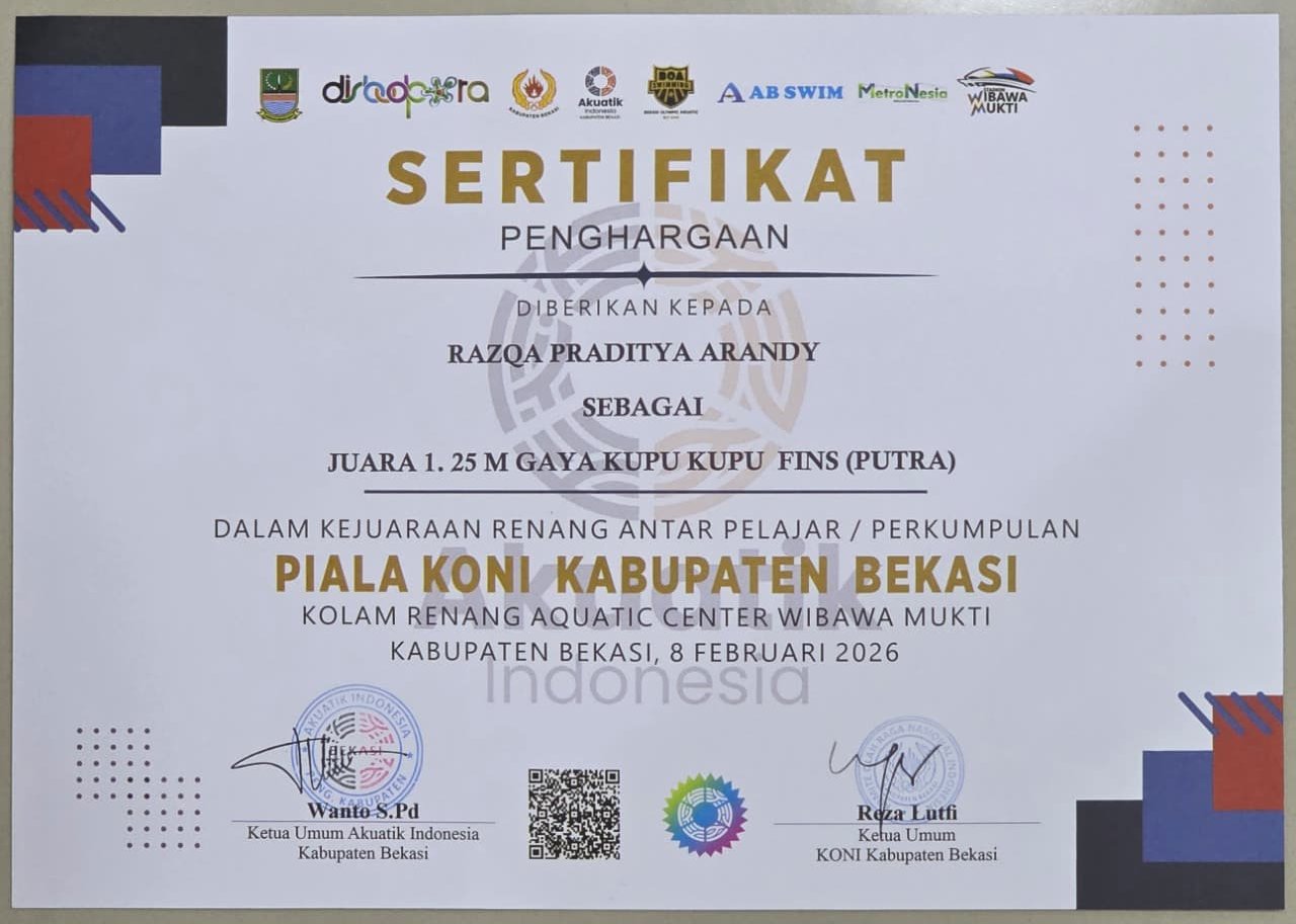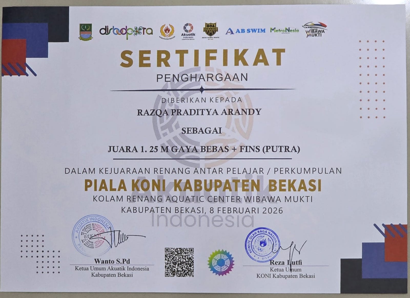 Bekasi – Kebanggaan luar biasa tengah menyelimuti keluarga besar SDIT IQRO Bekasi. Salah satu siswa berbakat, Razqa Praditya Arandy kelas 5A, berhasil meraih prestasi gemilang dengan menyabet 2 medali emas dalam ajang Kejuaraan Renang antar Pelajar dan Perkumpulan Piala KONI Kabupaten Bekasi yang diselenggarakan pada Ahad, 8 Februari 2026.