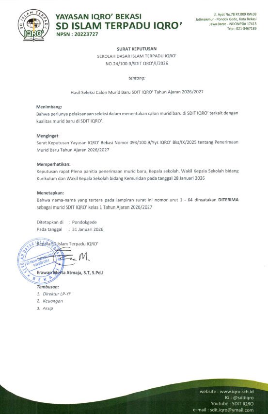 Sekolah Dasar Islam Terpadu IQRO’, Jl. Ayat No. 78 Jatimakmur Pondokgede Kota Bekasi. Telp 021 846 7189